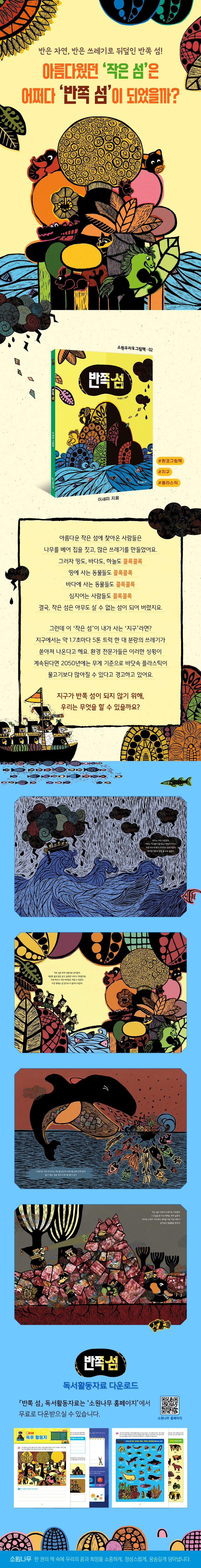 『반쪽 섬』은 아름다운 자연으로 가득했던 작은 섬이 쓰레기로 가득 차게 된 반쪽 섬으로 변하게 된 이야기를 담고 있습니다. 지금보다 더 많이 가지고 싶고, 더 편하게 살고 싶은 사람의 욕심이 어떠한 결과로 나타나게 되는지를 글과 그림으로 전달하고 있지요. 가만히 들여다보면 ‘작은 섬’은 ‘지구’와 많이 닮았습니다. 지구는 푸른 바다와 숲을 가진 아름다운 행성이지만, 무분별한 개발과 생산으로 점점 아름다운 모습을 잃어 가고 있습니다. 오늘날 지구에서는 약 1.7초마다 5톤 트럭 한 대 분량의 쓰레기가 쏟아져 나오고 있습니다. 환경 전문가들은 이러한 상황이 계속된다면 2050년에는 무게 기준으로 바닷속 플라스틱이 물고기보다 많아질 수 있다고 경고합니다. 우리가 작은 섬의 다섯 형제처럼 지구가 병드는 모습을 보고도 눈을 감고 모른 척한다면 지구도 『반쪽 섬』처럼 온통 쓰레기로 뒤덮일지 모릅니다. 포근한 안식처가 되어 주는 지구에서 역시 도망쳐야 할지도 모릅니다. 환경 문제를 나의 일로 여기고, 머리를 맞대어 함께 고민할 때 우리는 비로소 작은 섬인 지구를 지킬 수 있습니다.