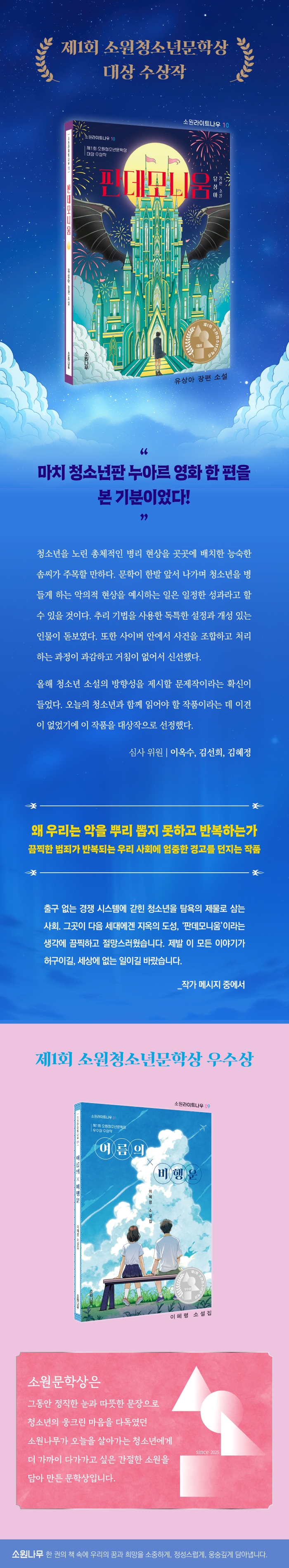 제1회 소원청소년문학상 대상 수상작, 『판데모니움』이 출간되었다. 소원청소년문학상은 그동안 정직한 눈과 따뜻한 문장으로 청소년의 웅크린 마음을 다독였던 소원나무가 오늘을 살아가는 청소년에게 더 가까이 다가가고 싶은 간절한 소원을 담아 만든 문학상이다.